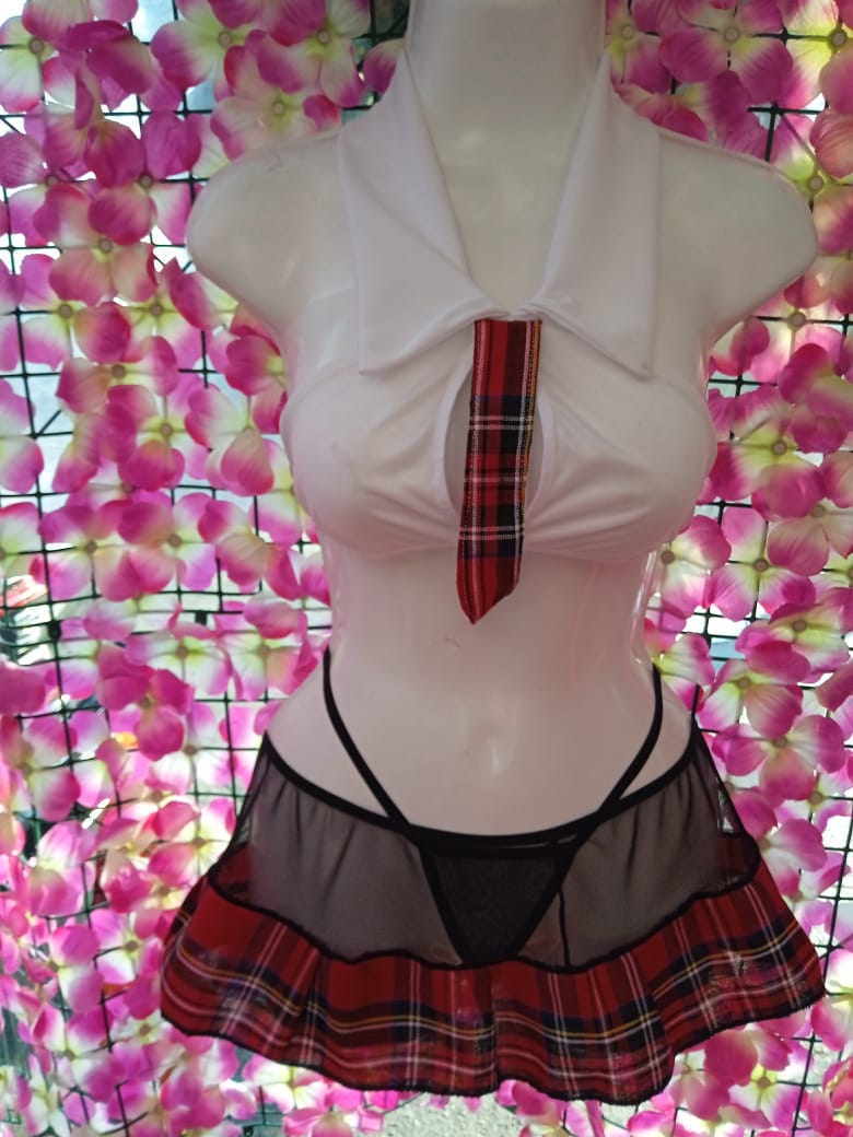 Incluye una blusa de tela ligera y transparente con cuello y lazo decorativo, acompañada de una faldita de cuadros que realza