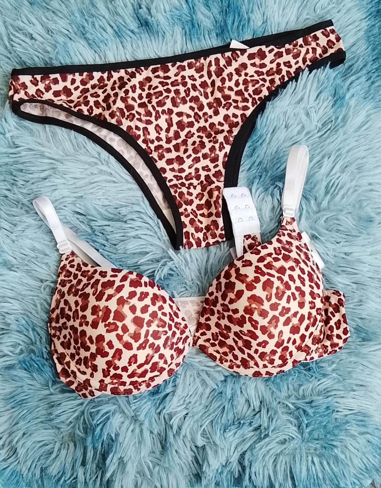 El conjunto incluye top y short a juego, confeccionados en una suave tela elástica con un vibrante estampado animal print